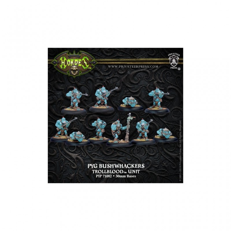 Les pygs sont les plus petits des trollkins. Ils sont connus pour leur dextérité, leur malice et leur compétence à tendre des embuscades et à coopérer pour abattre des proies bien plus grosses qu'eux. Et maintenant, ils ont des fusils ! Ils compensent leur discipline personnelle hasardeuse par leur enthousiasme et leur potentiel de destruction. En première ligne des armées trollkins, les Bushwhackers attendent le meilleur moment pour se jeter sur l'ennemi, mettant parfois fin au combat avant même qu'il ne commence.
