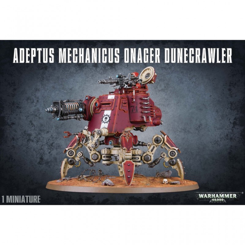 Ce kit plastique de 119 pièces, permet d'assembler un Onager Dunecrawler. Ce dernier est doté de quatre pattes de crabe avec blindage optionnel. La cabine et le réacteur blindés peuvent accueillir toute une variété d'options de modélisme : projecteurs, fumigènes, manipulateurs Cognis et sondes mentales. La coupole peut être ouverte ou fermée, avec ou sans Princeps servant une mitrailleuse. Avant même de choisir les armes, les possibilités de configuration et de personnalisation sont immenses.